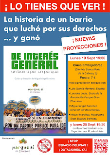 "De interés general. Un barrio por un parque" nos habla de la lucha de un barrio por conseguir las dotaciones prometidas, de la traición de las instituciones públicas a sus ciudadanos y de cómo la inteligencia, la entrega y la persistencia devuelve al disfrute de todos el espacio que unos pocos querían para su propio beneficio económico privado.